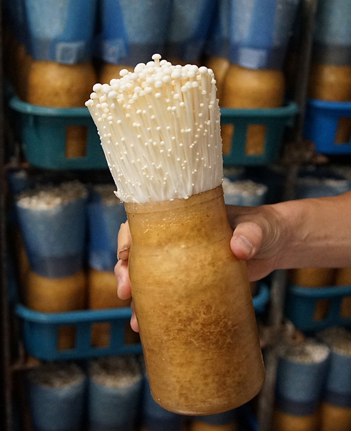 Whilst in some ways the problems that Kakeno Enoki faced in day-to-day management - in terms of ensuring their operation was not operating in the red, or managing workflow in moving their crop across multiple growing rooms - were a result of being a mid-sized operation in a market which was constantly throwing up new, large-scale, highly-mechanised farms that could produce at very low costs, Takeshi also talked as we walked around the harvesting and packing rooms of the upsides of their position in the industry. While Kakeno Enoki obviously relied on a great deal of mechanisation to produce at scale and at a decent cost, they still relied on labour when it came to harvesting the bottles by hand and weighing them into the correct amounts before being packaged in the JA brand plastic. While this was a cost, Takeshi told me, it also meant that they were able to have a bit of manoeuvrability unlike their larger competitors. He gave the example of how smaller packs of enoki - 100g, instead of the standard 200g - had started to go up in price relative to their weight. For smaller-scale producers harvesting and weighing by hand, it was relatively easy to pivot into smaller packs and make the most of this price difference; for highly mechanised operations `locked in` to one size, this is not possible.
