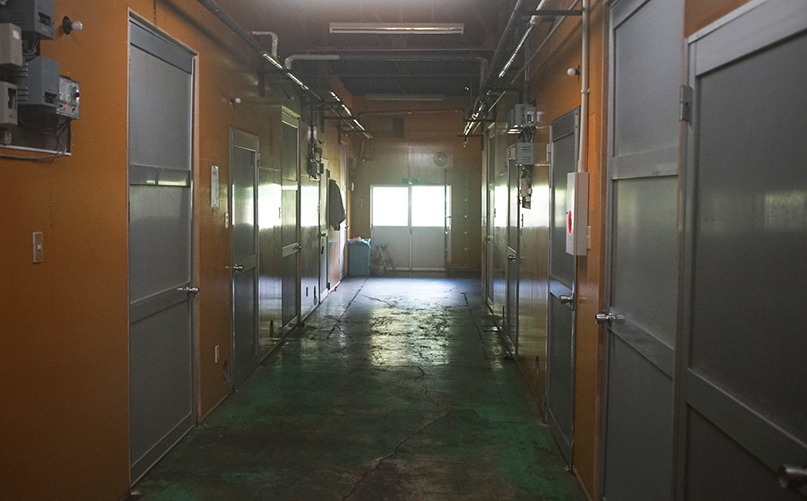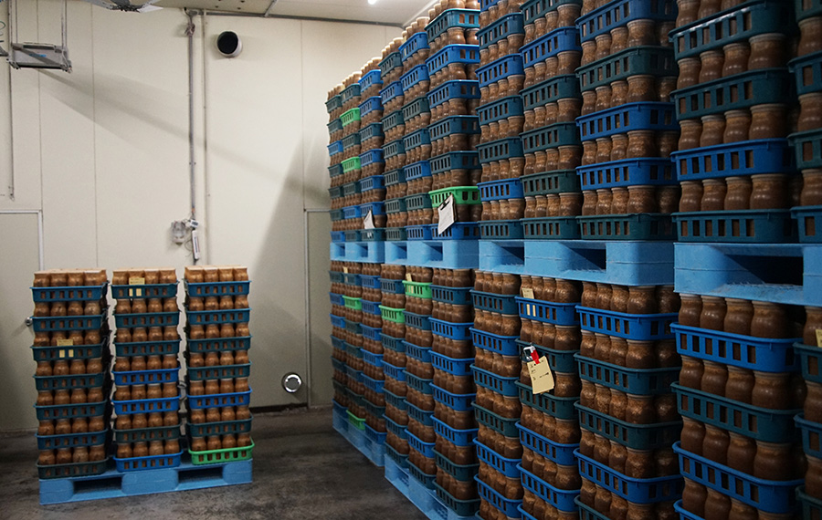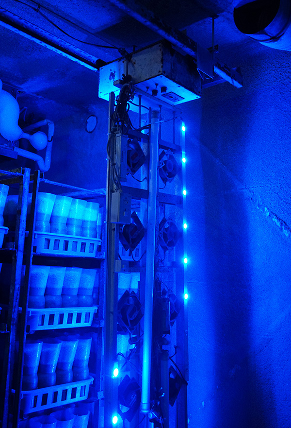 Whilst the systems that Kakeno Enoki had developed over the years were one way in which they could maintain quality and consistency in enoki production, it was clear talking with Takeshi and watching him interact with the crop that they were nothing without the experiences and finely-tuned senses of the growers themselves, built up over many years. Talking with him during the interview Takeshi told me how he never completely trusted the technical systems that were in place. Even when all the sensors read the perfect numbers for temperature, humidity, or COâ‚‚ level, Takeshi stressed that as a farm manager he had to trust his own senses: knowing what the right smell of a healthy growing room was, the sound of correctly functioning machines, or the `feel` of perfect climate conditions. The first thing Takeshi said he did when entering an incubation room was to take a deep breath, and get a sense of if anything was wrong. Touring the facility with Takeshi, this built-up experience was evident as he walked into different rooms. In incubation rooms, for example, he would pull down crates from the top of trolleys to check whether or not condensation was settling, telling me that this was his sign that the humidity was too high, even if it read correctly on the sensors. Similarly, in the fruiting rooms he would move around between the trolleys, picking up individual bottles to `feel` the correct firmness of the stems. Ultimately, having well-setup technical systems was just the first part of the puzzle; developing familiarity with the whole growing system (from crop through to machines) was also vital, allowing for adaptation and problem-solving in an industry where the little changes can make a big difference.
